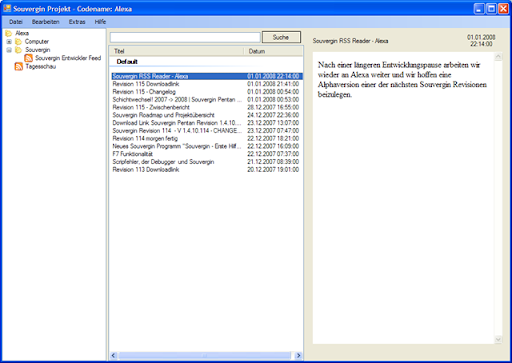 Auch wird Souvergin Funktionen bekommen um RSS und ATOM Feeds zu erkennen und dann Möglichkeiten Bieten diese Feeds in Souvergin Alexa zu laden. Wir werdem wohl aber auch Stand Alone Installationen ohne Souvergin anbieten. Dann werden solche Seiten im Internet Explorer geöffnet und nicht in Souvergin.